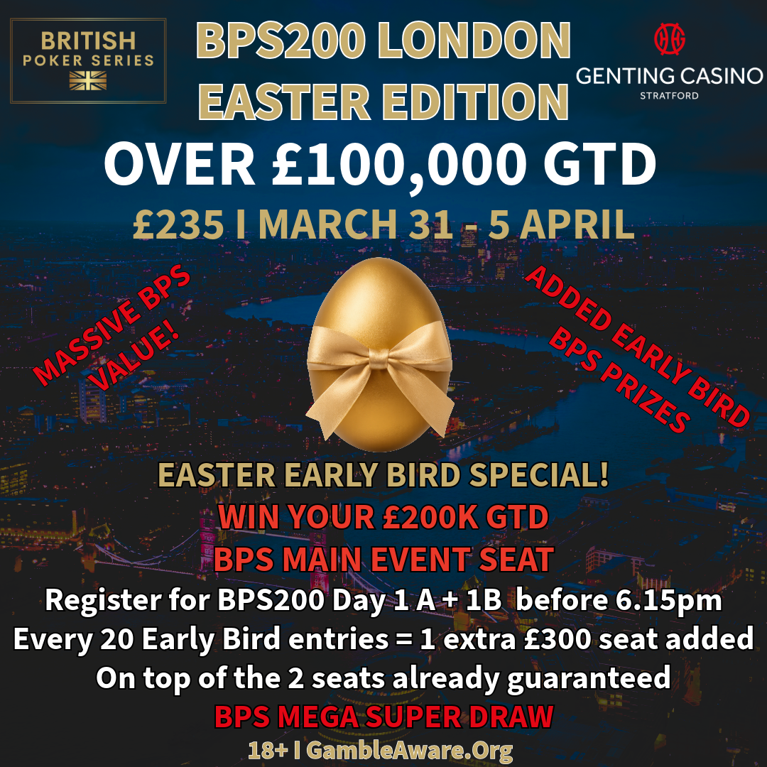 | 6.15pm | M | BPS200 Easter Edition - Day 1 A - Early Bird Prize | £100,000 | £200 | £35 | 25k | 30m | Unl. Re-entry | Level 12 |