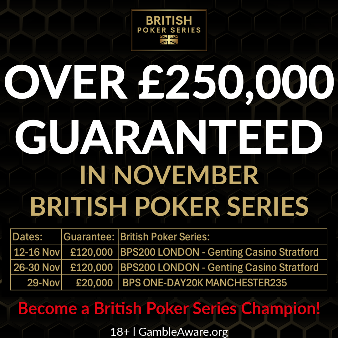 The British Poker Series is going all-in this November with over £250,000 in guaranteed prize pools across two flagship BPS200 London events and a BPS One Day 20K event in Manchester.
